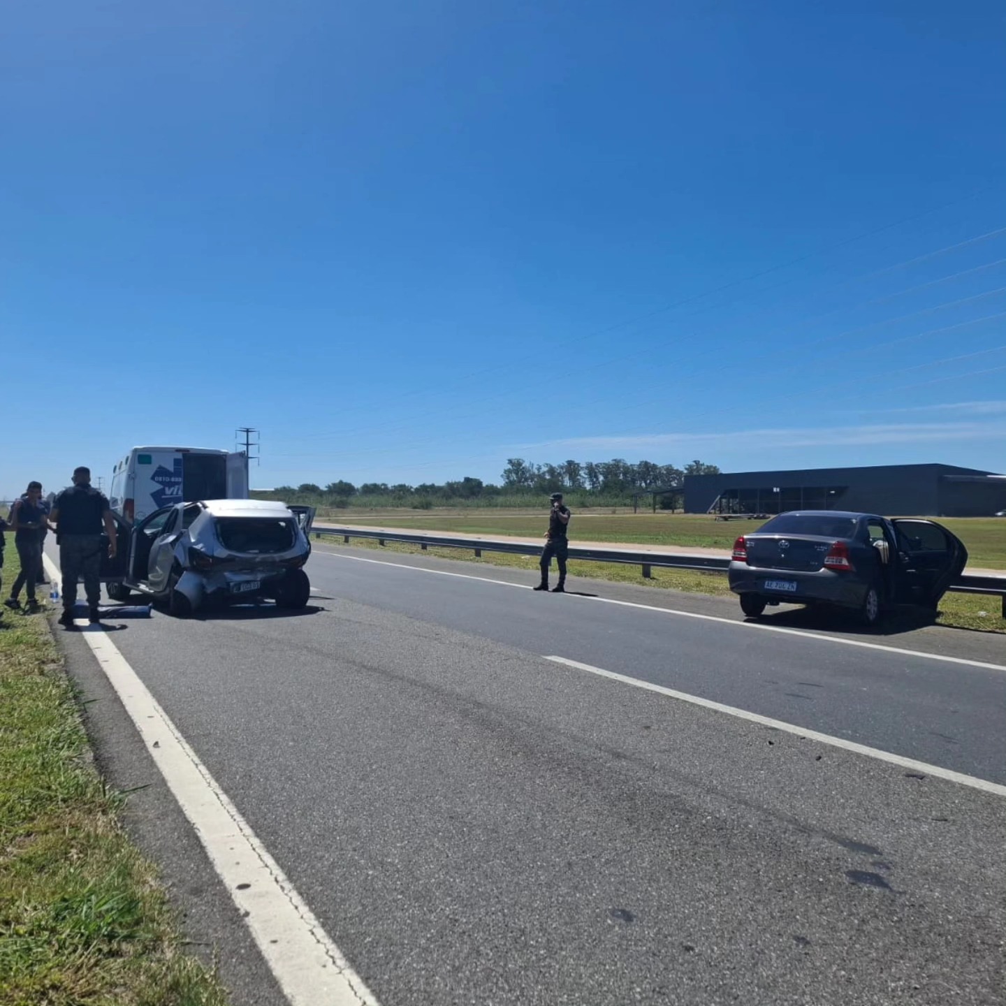 Se produjo una colisión entre dos automóviles sobre la calzada. Uno de los conductores de 51años con domicilio en Cordoba capital, con traumatismo de torax, transitaba en un Toyota Etios de color gris. El otro vehículo Renault Sandero de color gris, conducido por una mujer de 61años, quien posee traumatismo de cráneo, era acompañada por una mujer de 25 años quien posee escoriaciones, ( ambas oriundas de la ciudad de Córdoba Capital). El primero es trasladado a la ciudad de Córdoba y los demás al nosocomio de Pilar. La mecánica del accidente sería por alcance, impactando el vehículo Toyota detrás del Renault Sandero.
